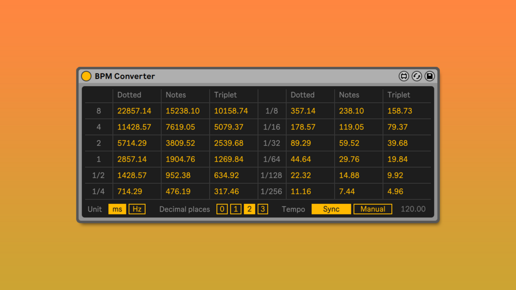 Use this plugin to convert BPM to ms and Hz. The values are automatically updated with the project tempo, although the BPM can also be set manually. They are displayed up to a maximum of 3 decimal places.