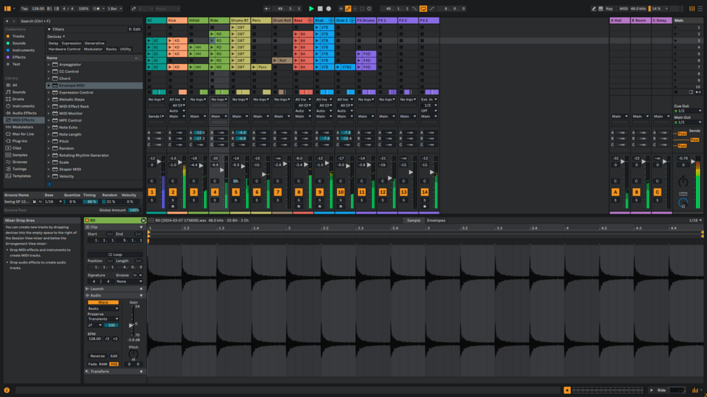 Dark theme for Ableton Live 12. In the screenshots the Grid Line Intensity of the Live settings is set to 50%.